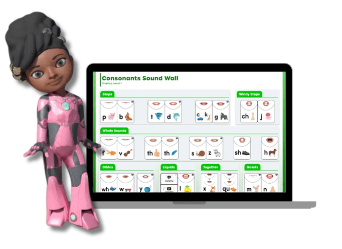 The RoboKind App introduces a robot named Jemi, a Virtual Avatar teaching assistant, designed to support students through specific parts of different lessons. Jemi’s friendly and interactive presence helps keep students engaged and focused while reinforcing literacy concepts.