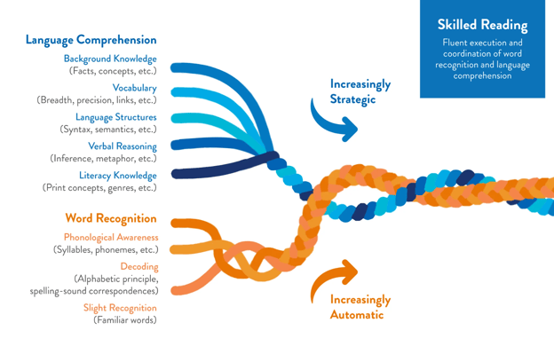 Exploring Scarborough's Reading Rope is a great way to understand how intertwined our comprehension and word recognition skills must be to become skilled readers. Developed by Dr. Hollis Scarborough, a renowned literacy researcher and cognitive psychologist, Scarborough's Reading Rope was designed to illustrate the "threads" of elements that must weave together when students are learning to read.